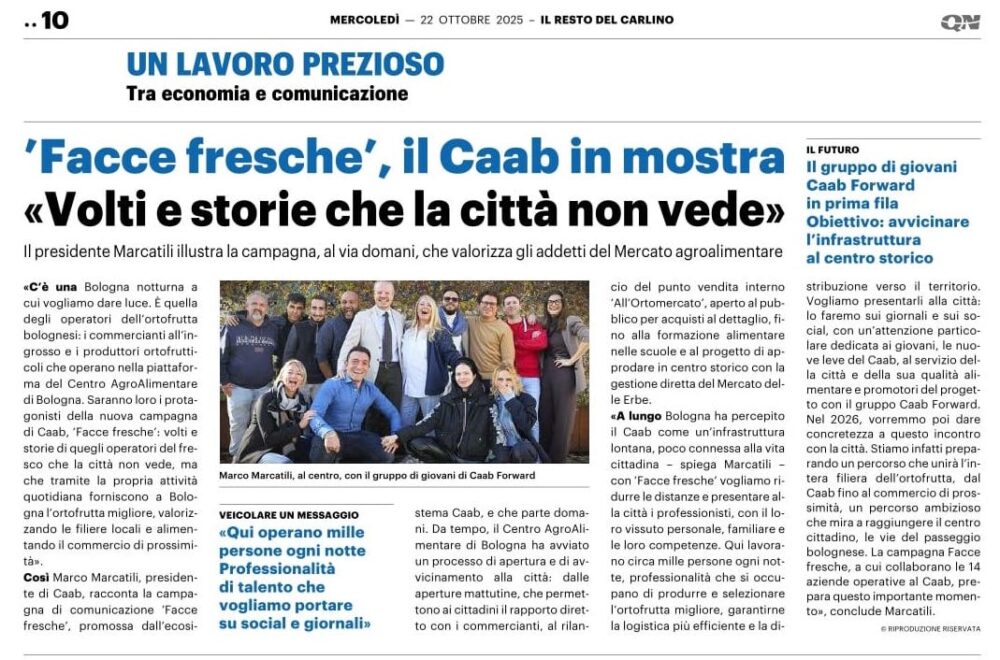 Si sta parlando tanto della nostra campagna “Facce Fresche” e Caab non puo che esserne orgoglioso. Grazie a tutte le redazioni per la condivisione di questo nuovo progetto di racconto che svela finalmente le facce del CAAB Spa – Centro Agroalimentare di Bologna. Dietro ogni volto c’è un’impresa, una storia, un impegno quotidiano per portare la migliore ortofrutta a Bologna e a tutta l’Italia.